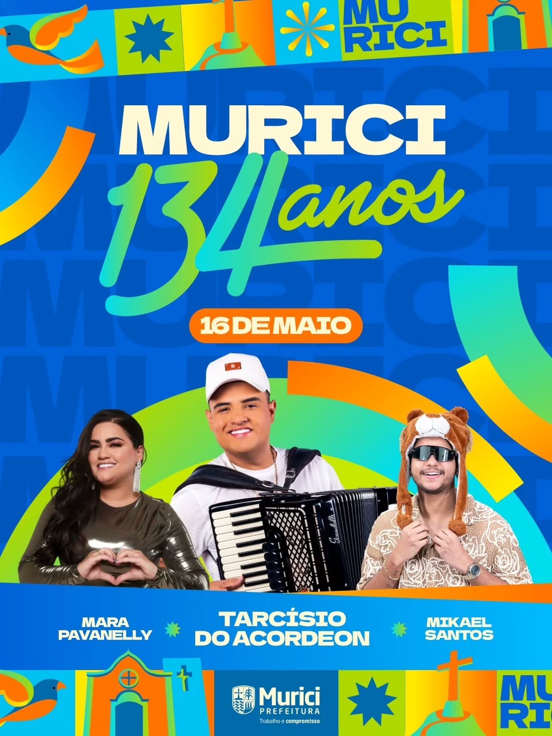 O prefeito Remi Filho divulgou a programação musical para comemorar os 134 anos de emancipação política de Murici, que acontecerá no dia 16 de maio. Os cantores Tarcísio do Acordeon, Mara Pavanelly e Mikael Santos prometem animar a noite com muito forró na Praça Padre Cícero, a partir das 22h.