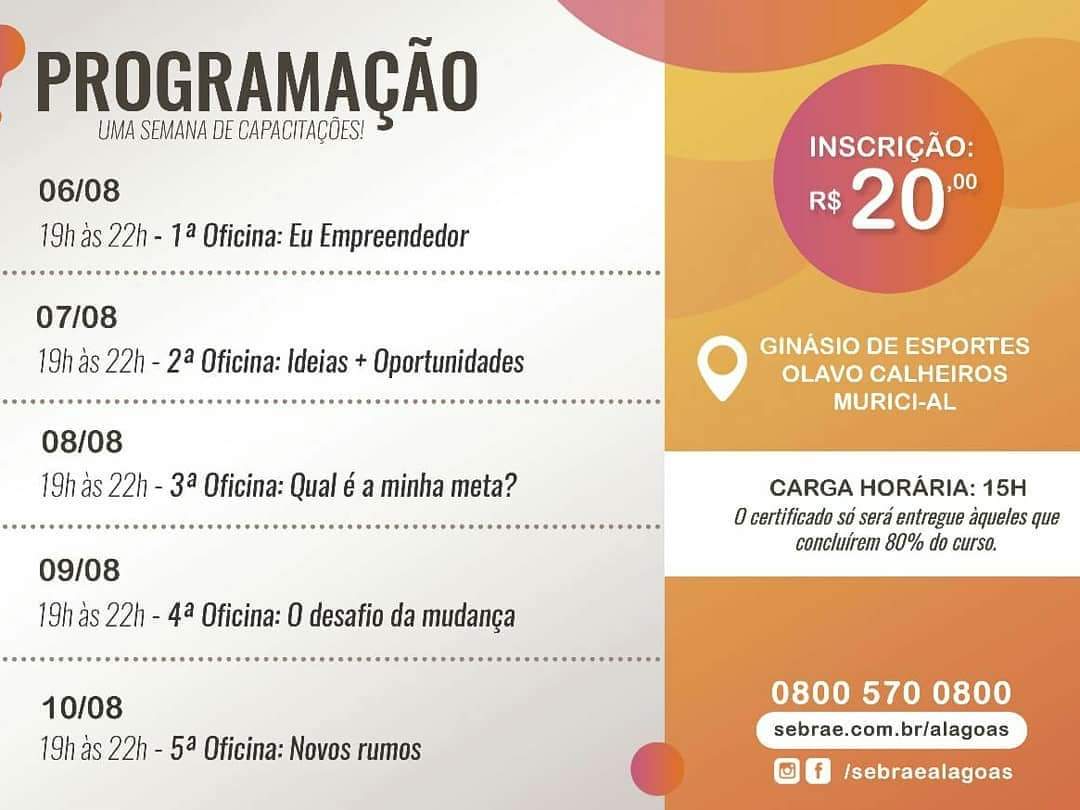 No período de 06 a 10 de agosto, o Sebrae Alagoas realizará o curso ‘Como Desenvolver uma Empresa de Sucesso’, no Ginásio de Esportes Olavo Calheiros, em Murici. O evento conta com a parceria da Prefeitura de Murici e o apoio da Associação Comercial, e visa estimular o desenvolvimento do perfil empreendedor nos participantes a partir de oficinas com temas vividos no dia a dia das micro e pequenas empresas, com a identificação de oportunidades no ambiente local.