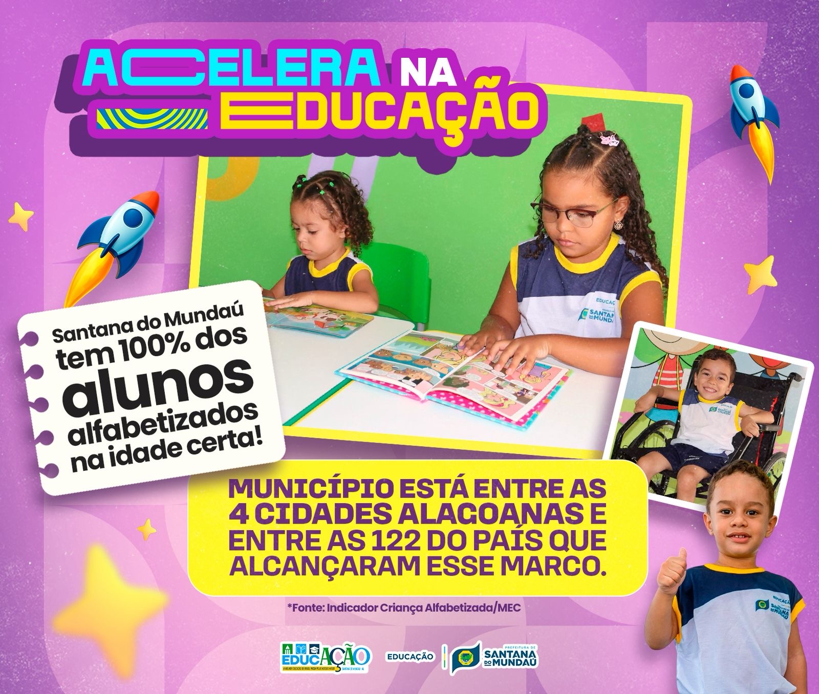 Com índices educacionais elevados e reconhecimento a nível estadual e nacional, a educação de Santana do Mundaú alcançou mais um grande marco: 100% dos alunos alfabetizados na idade certa. Os dados divulgados na última quarta-feira (1º) pelo MEC, através do Indicador Criança Alfabetizada, apresentou os resultados por município em todo o país – e apenas quatro cidades alcançaram esse feito em Alagoas.
